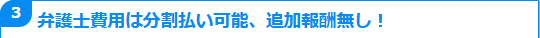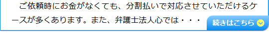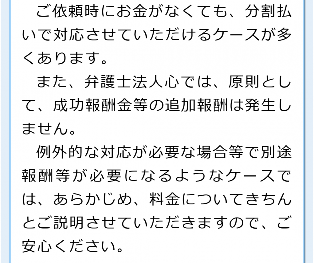 任意整理など債務に関するご相談は原則として相談料が無料となっておりますし、ご依頼後の費用も分割払いで対応させていただける場合がありますので、費用面が気になっている方も安心してご相談いただけます。