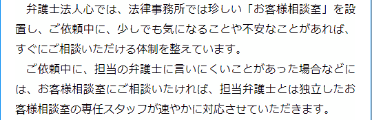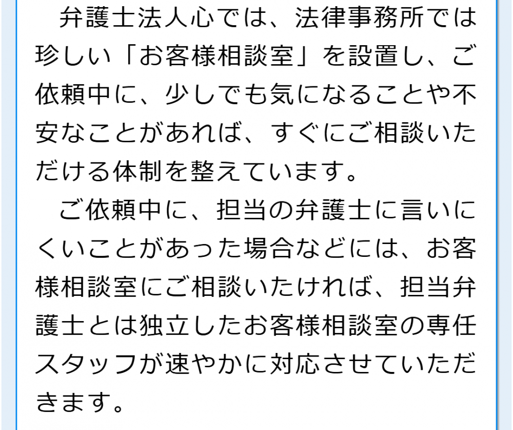 ご依頼中にもしものことがありましたらお客様相談室をご利用ください。担当弁護士やスタッフとは独立した専属のスタッフがご対応いたします。