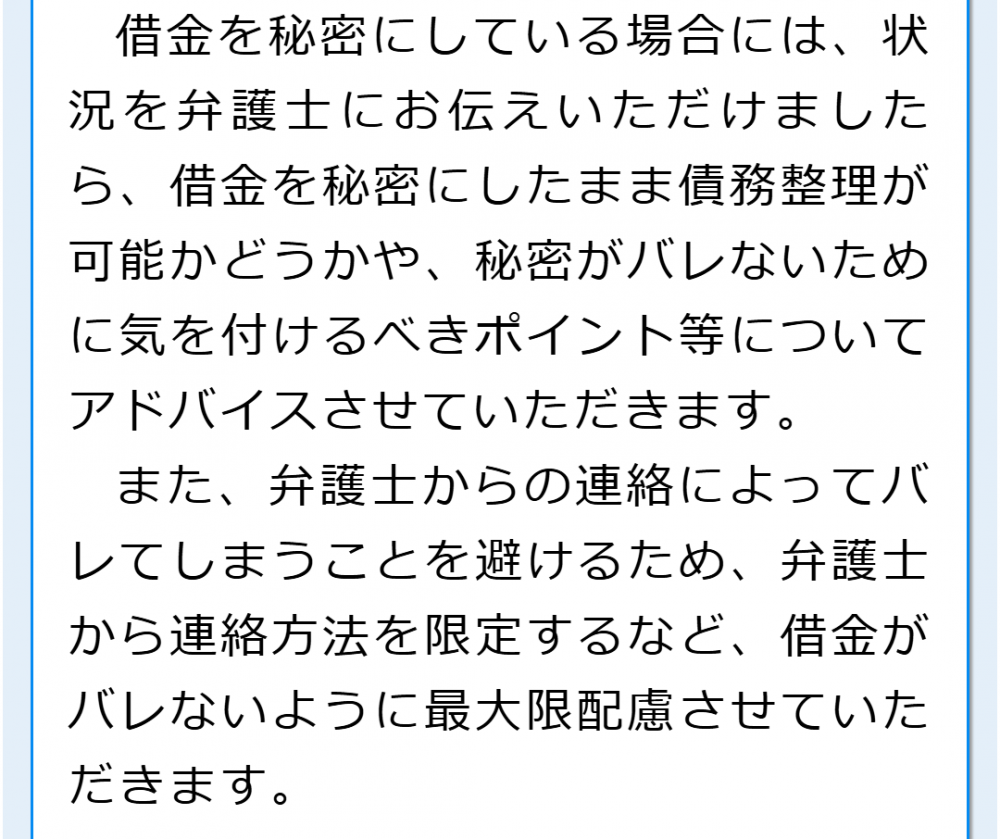 借金をしている方の中には、家族や勤め先に借金のことを知られたくないという方もいらっしゃるかと思いますが、そのような場合にも、しっかりと配慮して対応いたします。